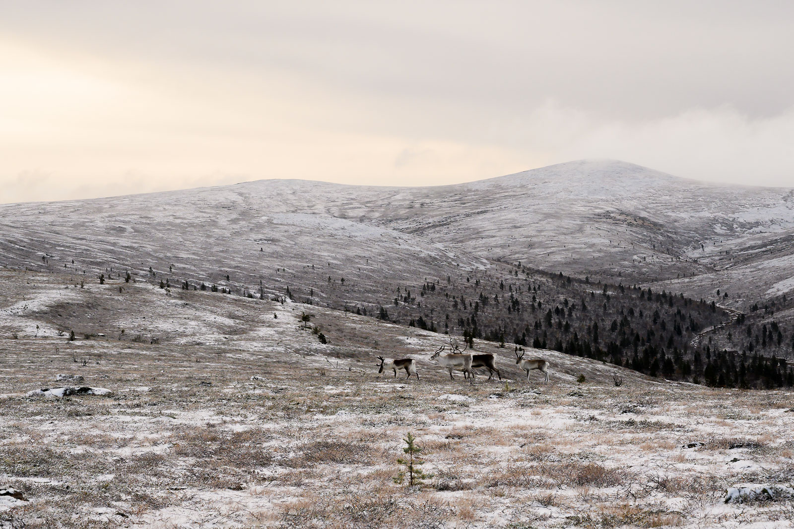 Laitan vielä ekstarana tähän kuvan lumisen aamun vaelluksesta Pälkkimäpäältä, jossa neljä poroa tuli meitä tervehtimään. Kuvassa näkyy myös luminen tunturimaisema, joka sai vaellussuunnitelmamme muuttumaan.